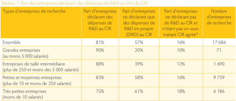 Par ailleurs, l’étude publiée par l’EDHEC montre qu’une partie des entreprises faisant de la R&D et déclarant de la R&D au CIR ne sont pas couvertes par l’enquête du ministère de l’Enseignement supérieur, de la Recherche et de l’Innovation (MESRI), qui sert de référence pour mesurer les dépenses totales de R&D au niveau national. En effet, certaines entreprises sortent du champ de l’enquête, soit parce qu’elles n’effectuent de la R&D (et ne la déclarent au titre du CIR) que de manière ponctuelle, soit parce qu’elles ont cessé leur activité (liquidation, etc.).