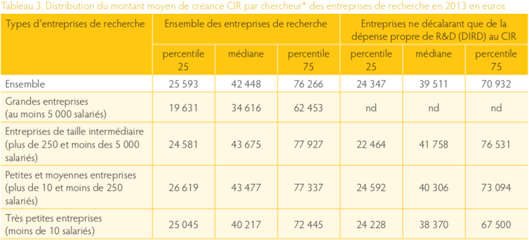 Certains éléments de la mise en œuvre, que l’étude discute à partir d’une enquête qualitative exploratoire réalisée par des étudiants de l’EDHEC, peuvent expliquer ces décalages. En effet, cette partie de l’étude permet de mettre en évidence l’existence de coûts administratifs importants qui s’expliquent par la nécessité d’avoir un document de présentation du projet de recherche à même de convaincre l’administration fiscale, et un processus efficient de traçabilité des dépenses internes dédiées à la R&D : on ne s’improvise pas entreprise centrée sur la recherche ! À cela s’ajoute potentiellement un contrôle de conformité de l’administration fiscale, dont la différence avec un contrôle fiscal (qu’il peut en partie annoncer…) n’est pas toujours claire pour les petites entreprises. Ces éléments peuvent conduire les entreprises à une certaine « prudence » dans la déclaration de leurs dépenses au titre du CIR, c’est-à-dire à déclarer moins que ce qu’elles font effectivement… voire à ne rien déclarer du tout ! Pourtant, le retour fiscal que les entreprises peuvent attendre du CIR n’est pas négligeable : l’étude montre que ce montant de la créance par chercheur a une médiane qui se situe à environ 42 000 euros, et que pour 25 % des entreprises ce montant est supérieur à 72 000 euros, comme indiqué dans le tableau ci-dessous.